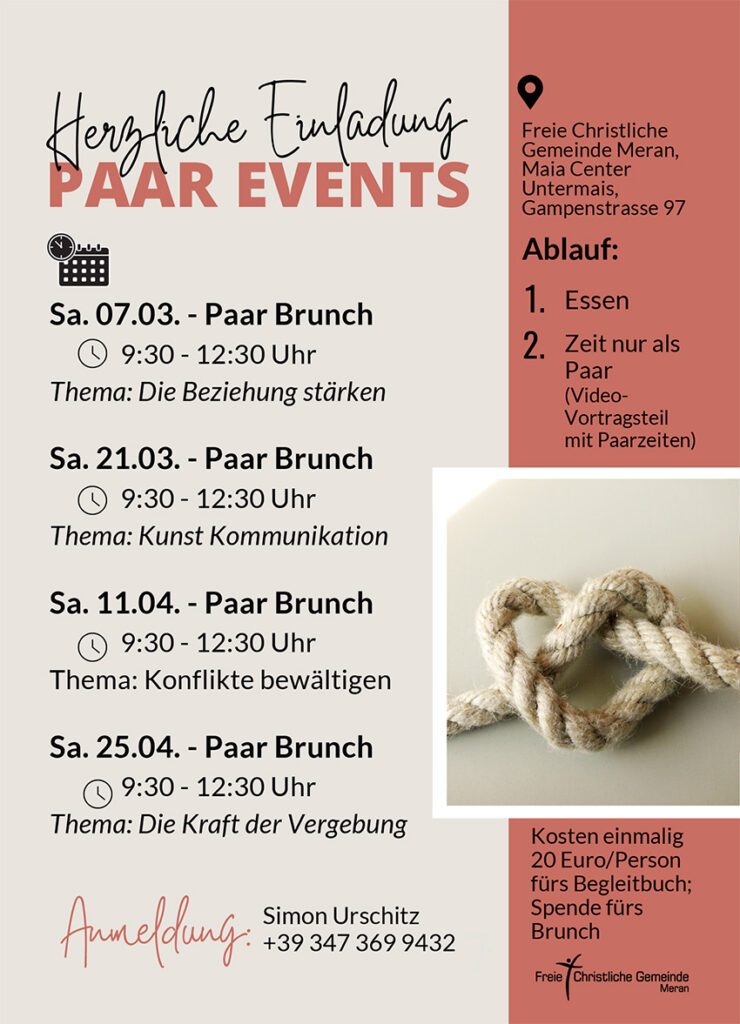 Herzlich willkommen auf der Website der Freien Christlichen Gemeinde Meran. Wir sind eine Gemeinschaft von Christen und möchten durch unser Leben zum Glauben an Jesus Christus einladen. Wir freuen uns, Sie auch persönlich in einem unserer Gottesdienste kennenlernen zu können: